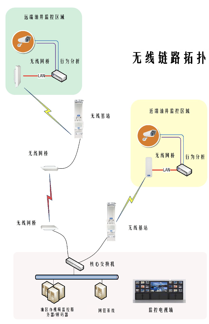 根據在甲方現場調研,應用環境在油區辦360度分布著采油設備。了解應用環境為固定方式遠程無線視頻監控進行使用,采用無線基站,無線網橋覆蓋應用場所,覆蓋要求滿足網橋與基站的鏈接,應用業務主要以視頻為主,在架設的覆蓋專網內承接70余個視頻監控的應用,基站架設可以靈活、高效的實現數據,視頻實時傳輸,網絡穩定可靠、安全保密,同時大大減少施工量和施工難度,降低投入成本,也有效降低了今后的管理和維護成本。