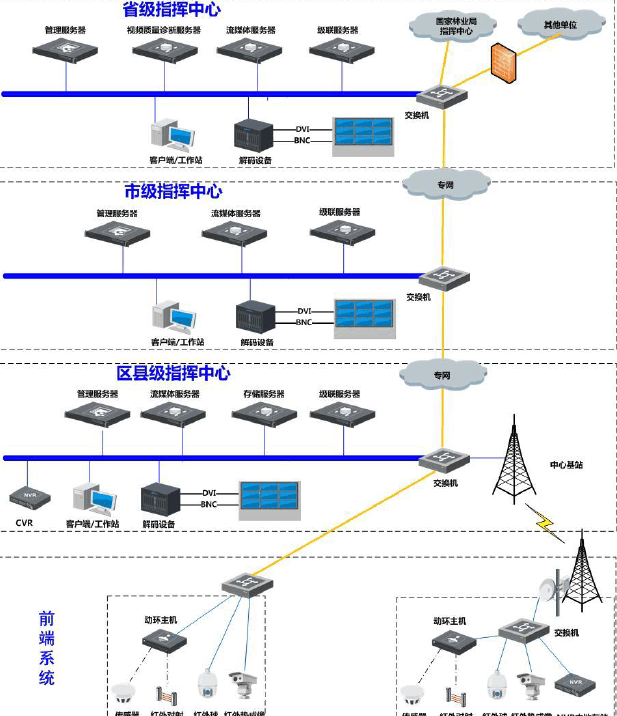 省級(jí)指揮中心部署視頻監(jiān)控平臺(tái)軟件,通過專網(wǎng)線路連接國(guó)家林業(yè)指揮中心、市級(jí)指揮中心和部分其他單位。市級(jí)指揮中心通過專網(wǎng)線路分別和省指揮中心以及區(qū)縣級(jí)指揮中心連接,市級(jí)指揮中心部署視頻監(jiān)控平臺(tái)軟件,實(shí)現(xiàn)和省級(jí)及區(qū)縣級(jí)的平臺(tái)進(jìn)行聯(lián)網(wǎng)。區(qū)縣級(jí)指揮中心通過專網(wǎng)線路連接市級(jí)指揮中心,同時(shí)部署視頻監(jiān)控平臺(tái)軟件和市級(jí)平臺(tái)進(jìn)行聯(lián)網(wǎng)。前端系統(tǒng)通過光纖線路連接到區(qū)縣級(jí)指揮中心,無法通過光纖線路連接的前端系統(tǒng),通過微波方式連接到區(qū)縣級(jí)指揮中心。