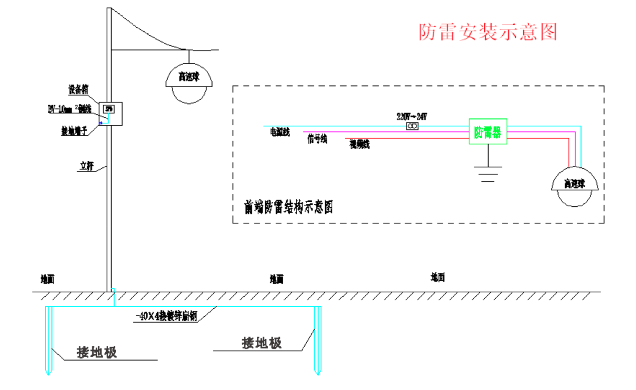 室外雷擊途徑主要有:沿電源線路、視頻線路、控制線路侵入的雷擊和過電壓,可能會(huì)危及攝像機(jī),當(dāng)金屬立桿遭遇直擊雷襲擊時(shí),其金屬桿體往下泄流的瞬間會(huì)對(duì)其內(nèi)部的信號(hào)線路產(chǎn)生比較強(qiáng)烈的干擾。所以本次項(xiàng)目所在地室外攝像機(jī)立桿應(yīng)做以防雷接地裝置。
