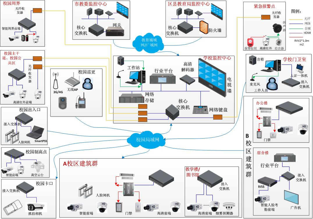 大型應用系統前端接入多個子系統設備,可包括高清視頻監控系統、入侵報警系統、車輛管理系統、可視對講系統、人員通道系統、門禁管理系統、在線巡查系統等,其中若干子系統組成智慧高校系統應用。