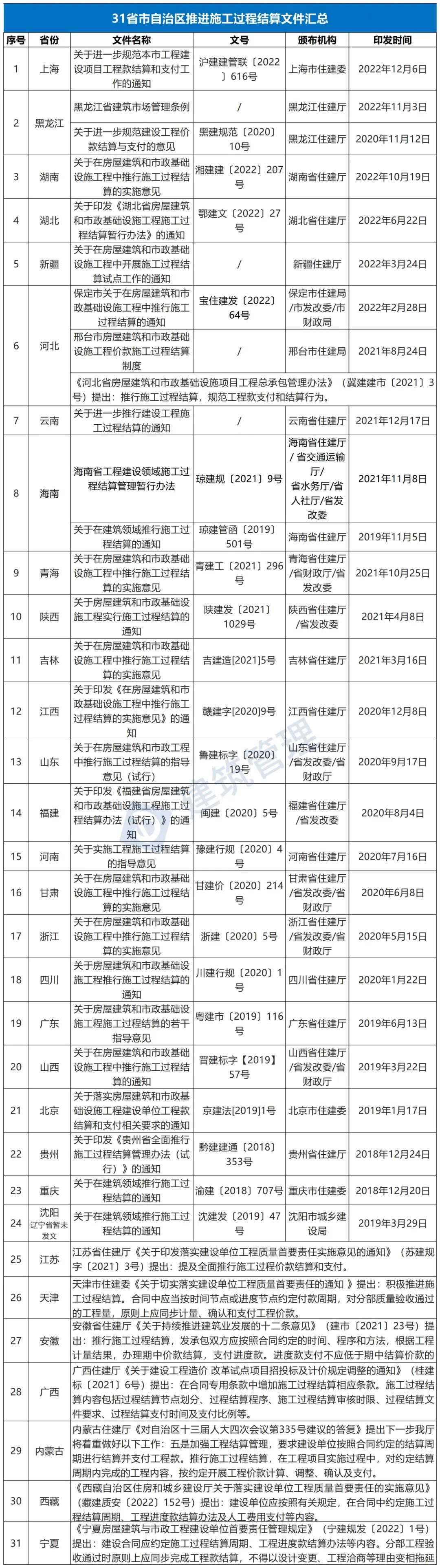 31省市區(qū)推行施工過程結(jié)算情況如下: