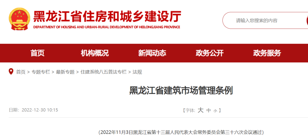2022年11月3日黑龍江省第十三屆人民代表大會(huì)常務(wù)委員會(huì)第三十六次會(huì)議通過,《黑龍江省建筑市場管理?xiàng)l例》自2023年1月1日起施行。